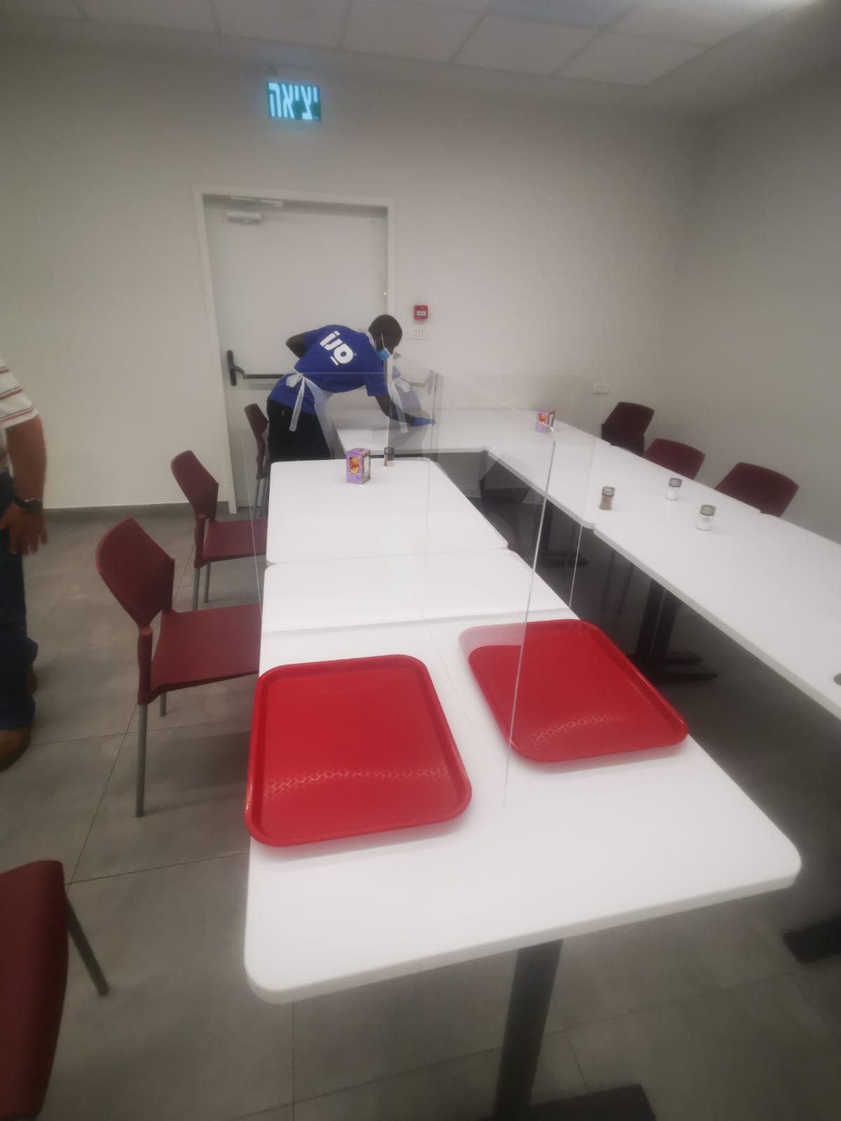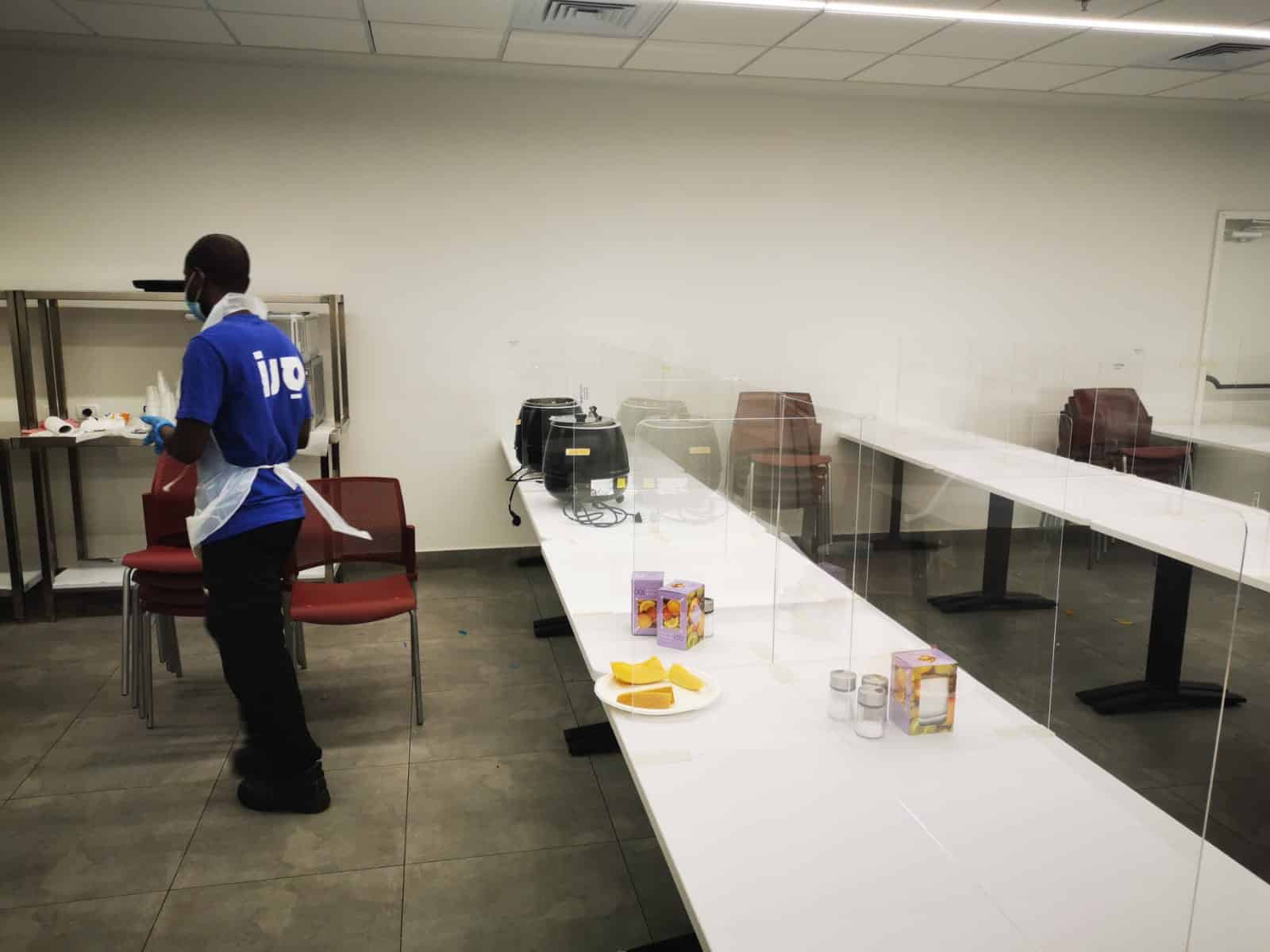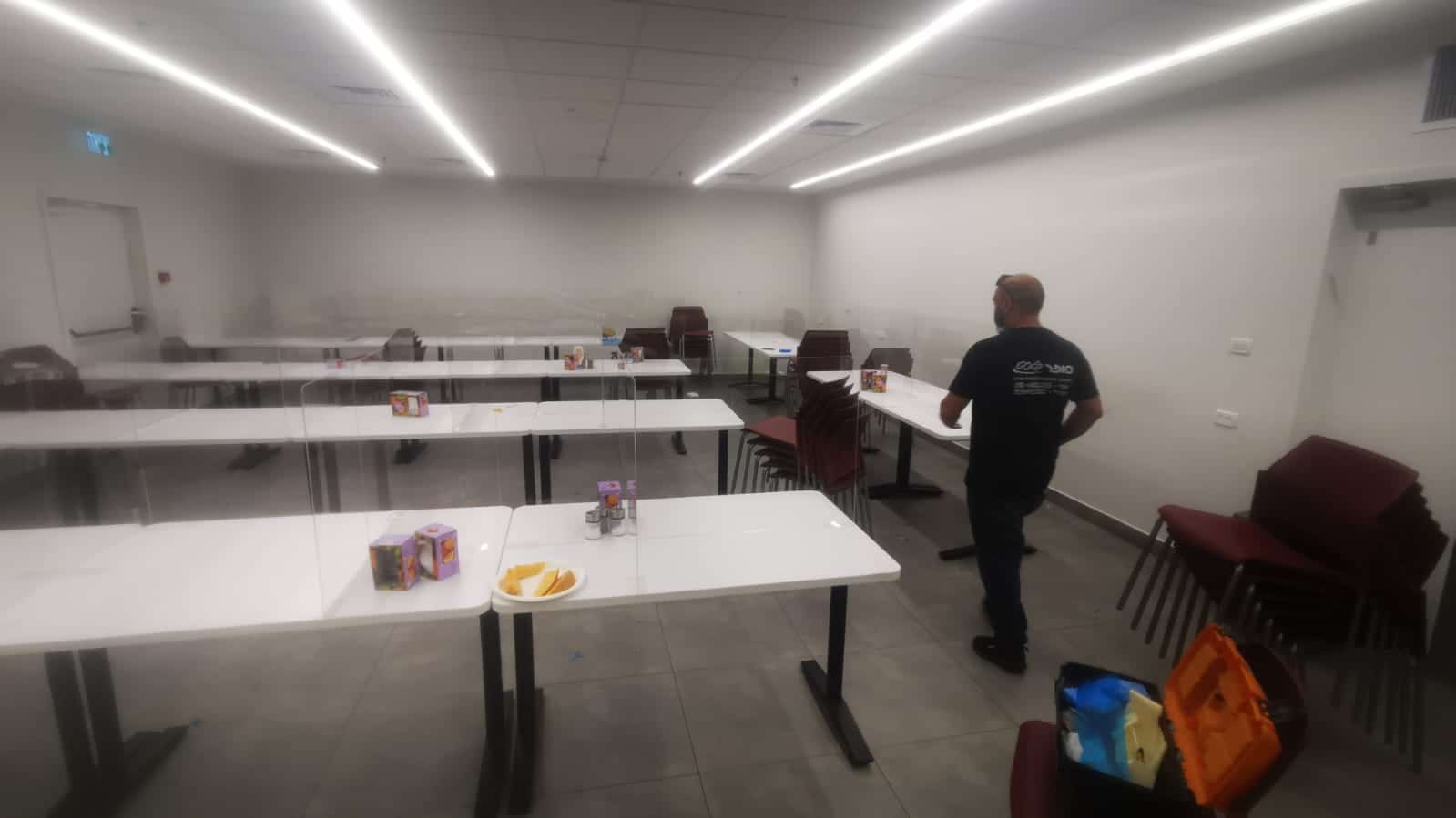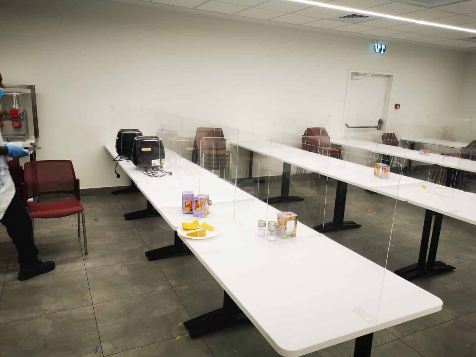 בהתאם להנחיות שמירה על הפרדה מלאה ומרחקי 2 מ' בין שולחנות בחדר האוכל במפעל.